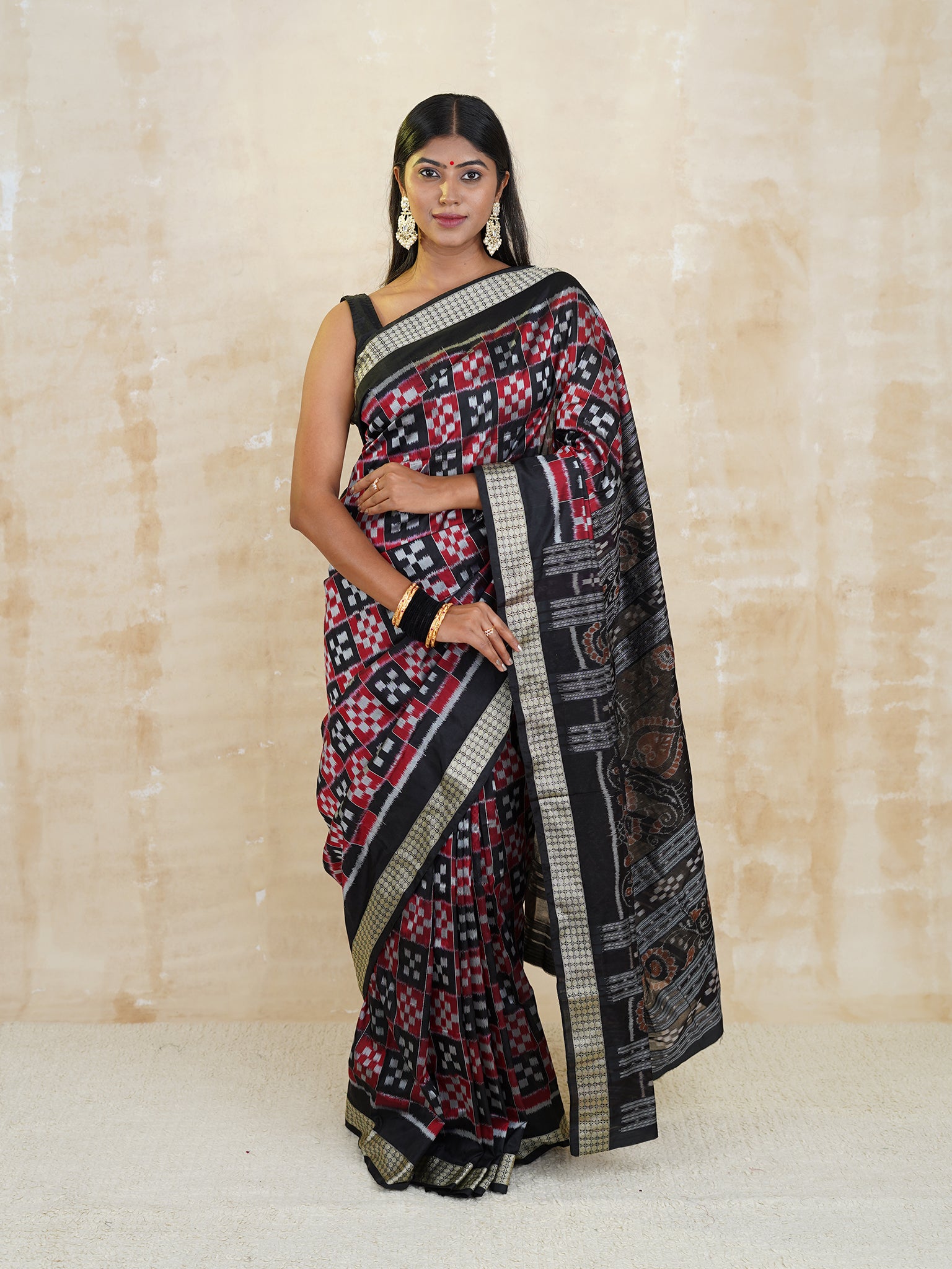 Sambalpuri sarees are famous for their stunning borders. Whether it’s a traditional Pasapalli (checkered) design or a bold modern pattern, these borders highlight the fusion of art and culture.