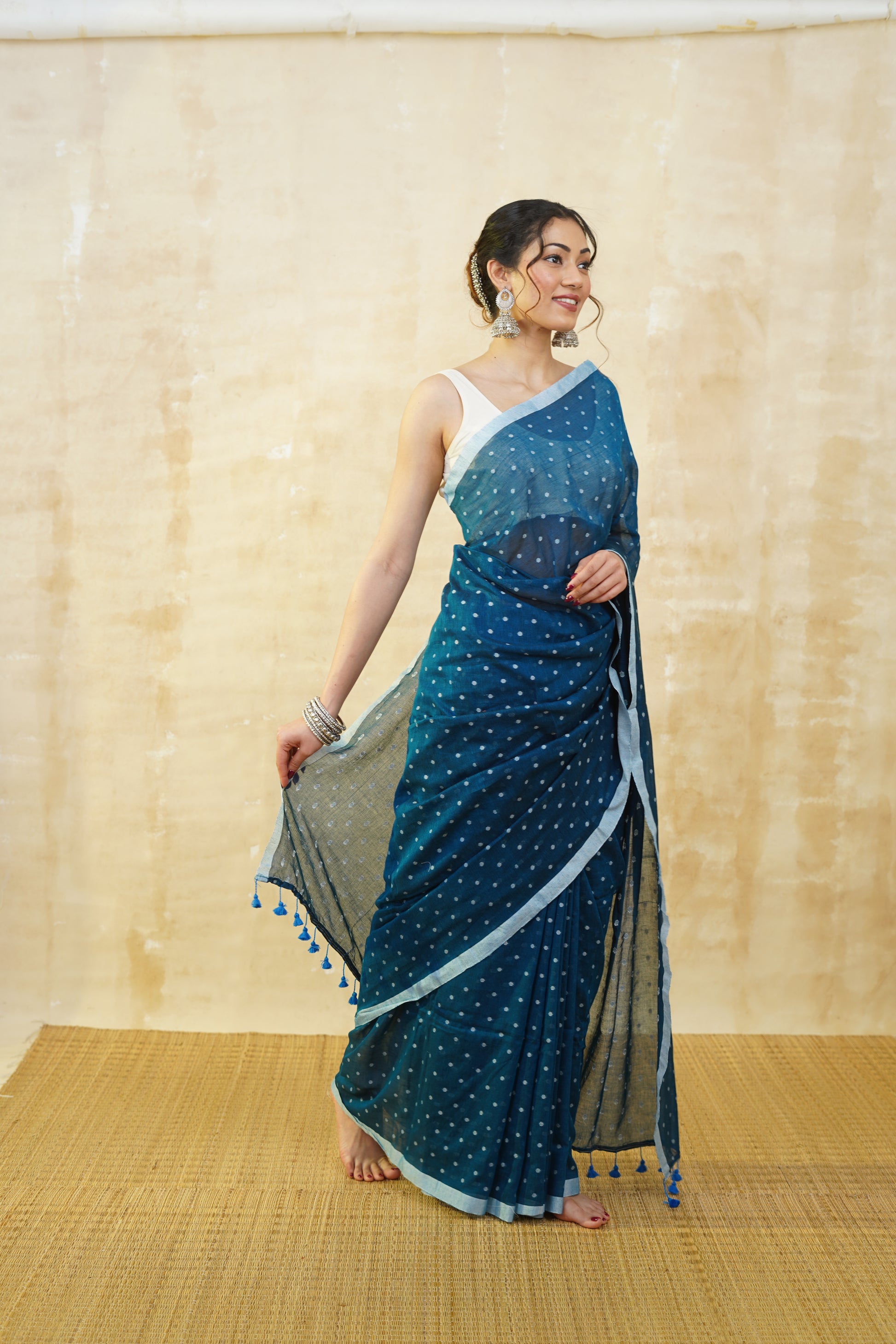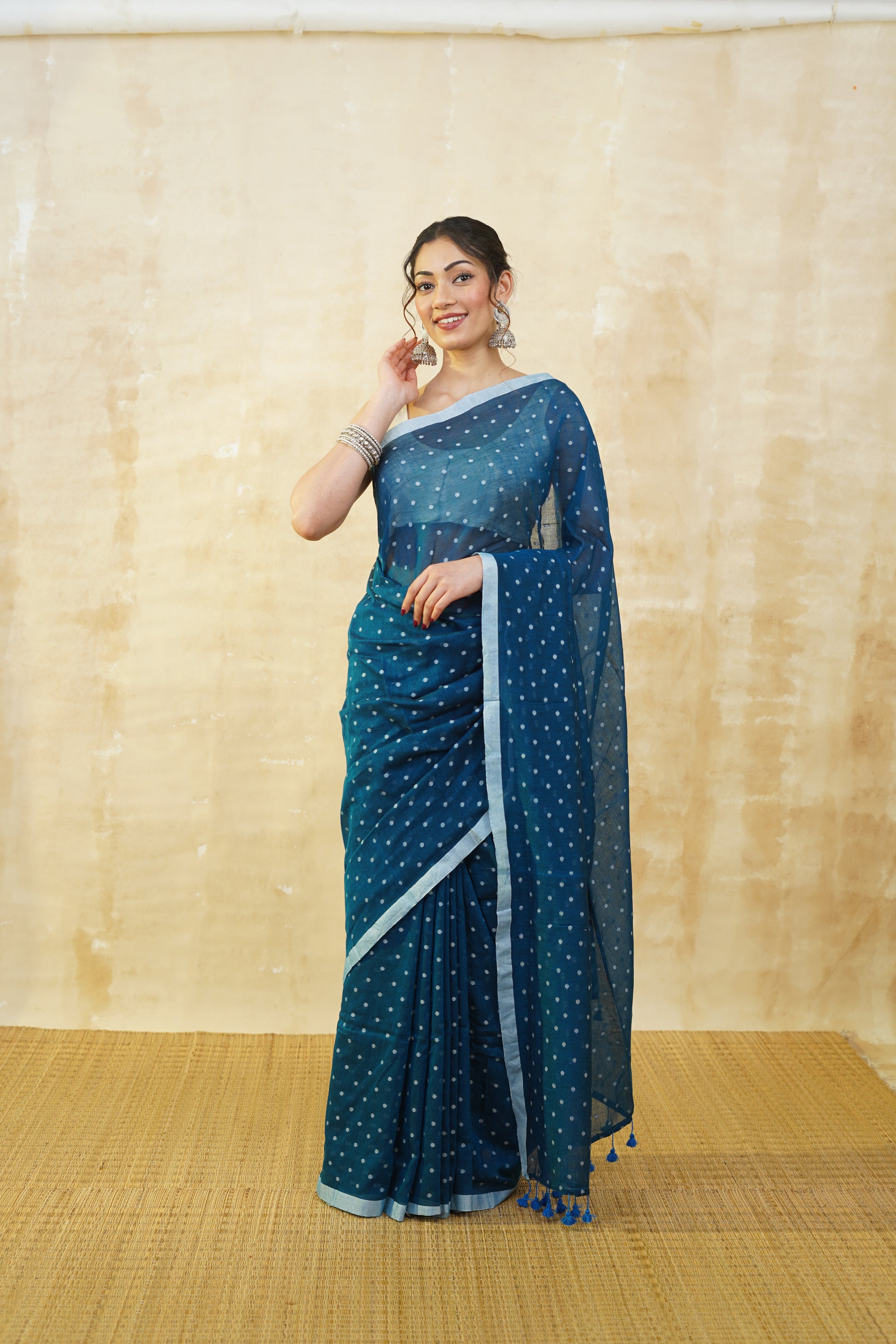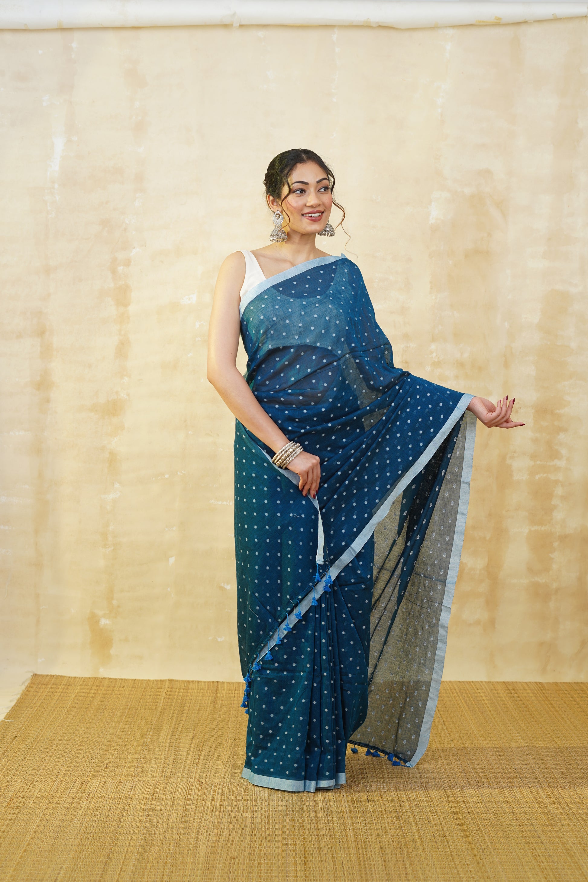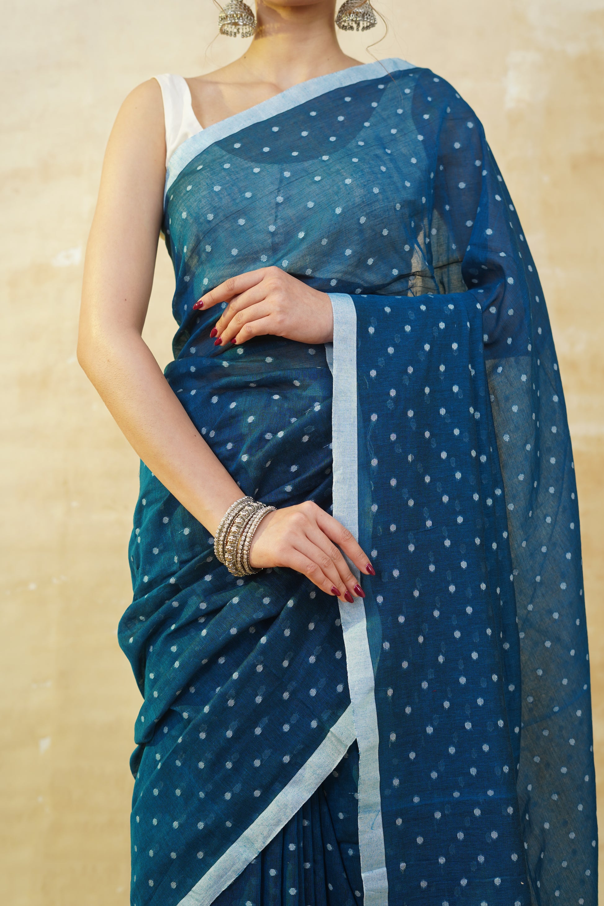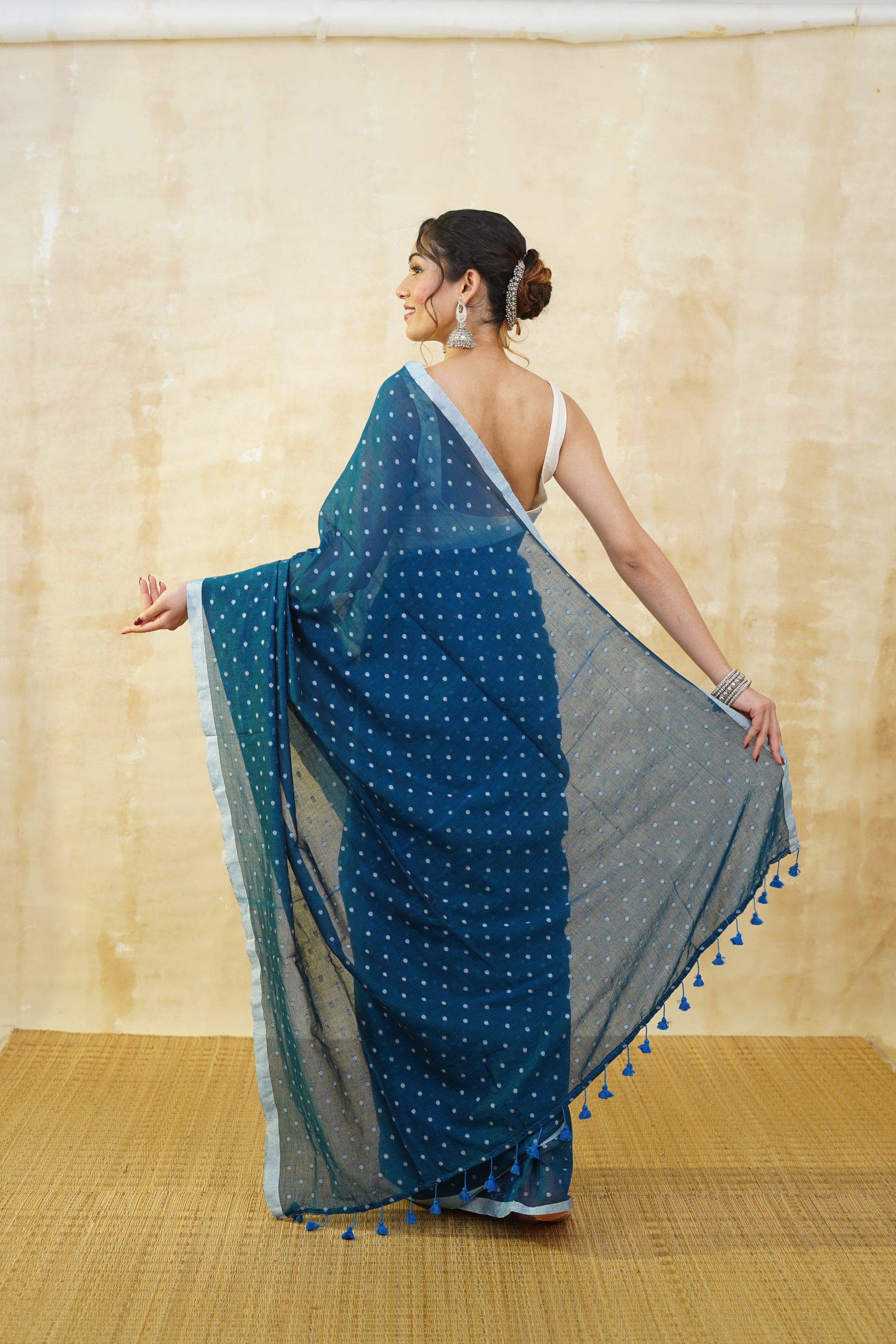 Blue Pure Cotton Saree with white polka dots, a delightful blend of fresh elegance and playful charm. The striking blue adds a refreshing pop of color, bringing vibrancy and balance to the saree’s overall appeal.