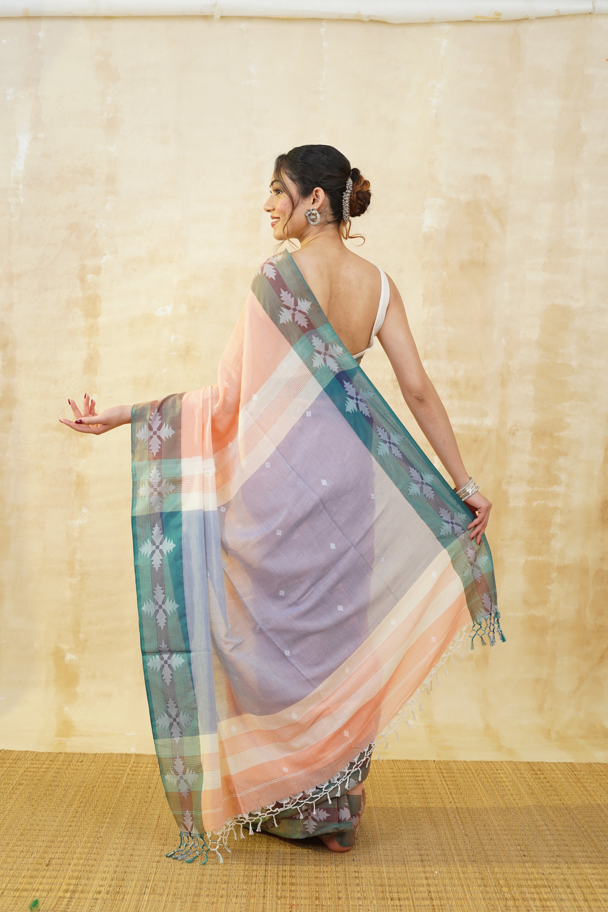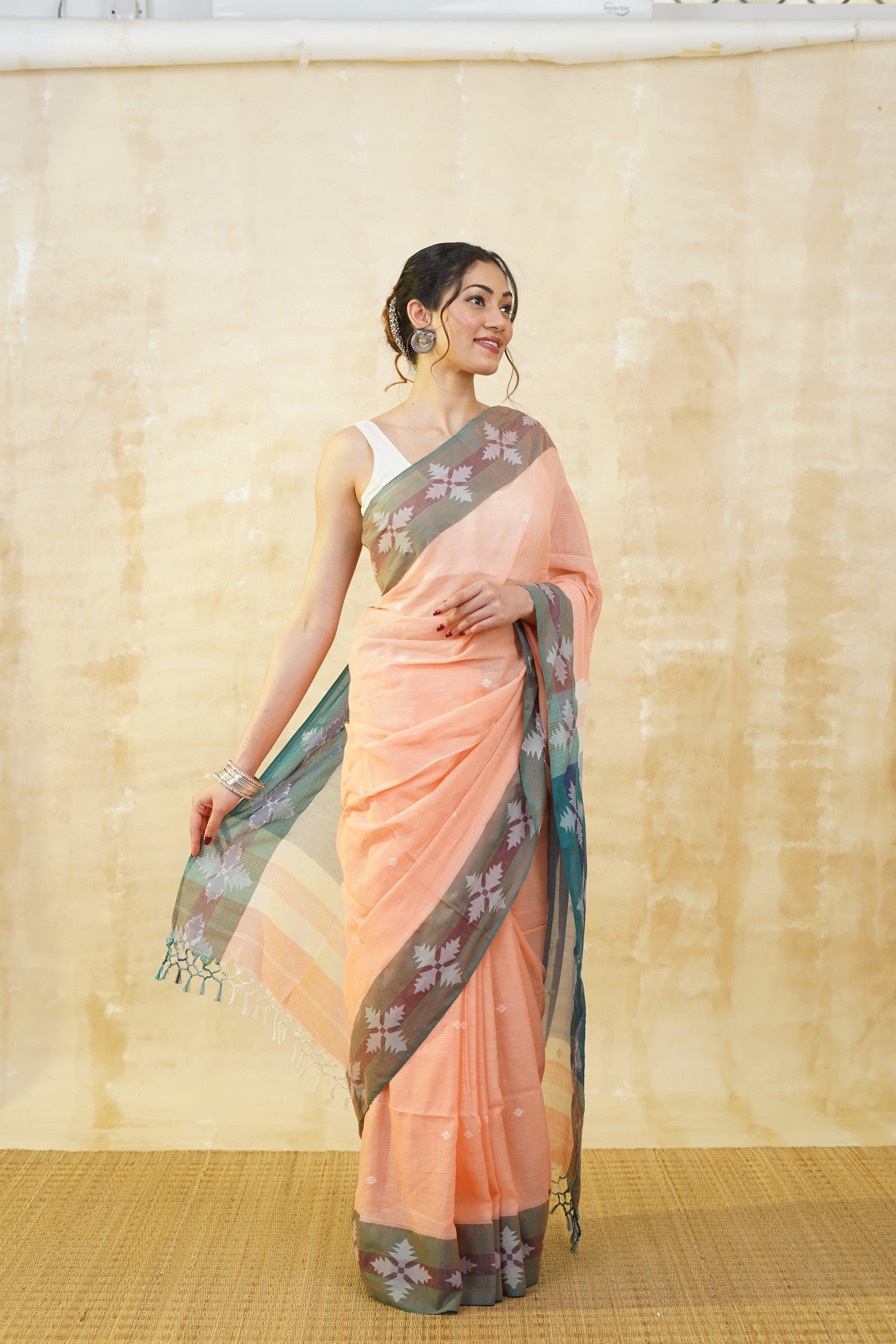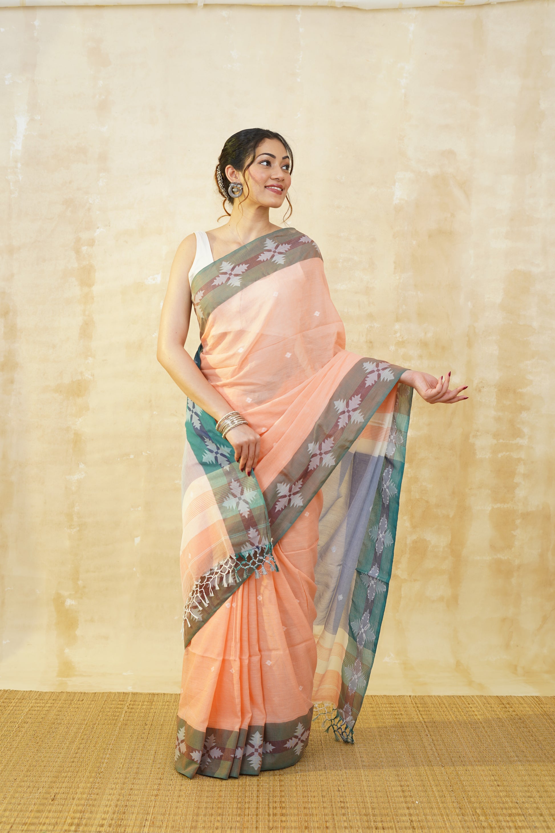 This saree is the epitome of fresh elegance! The soft cantaloupe orange hue radiates warmth and vibrancy, bringing a cheerful charm to your wardrobe. Made from 100% pure cotton, the fabric boasts an incredible softness, lightweight feel, and breathable texture, ensuring unmatched comfort with every wear. The saree's fluid drape is as effortless as it is graceful, making it ideal for both casual gatherings and more relaxed occasions. Its subtle border adds a refined touch, while the delicate woven motifs on the body enhance its timeless beauty. Experience the perfect blend of comfort and style with this cantaloupe orange saree, where elegance meets ease.