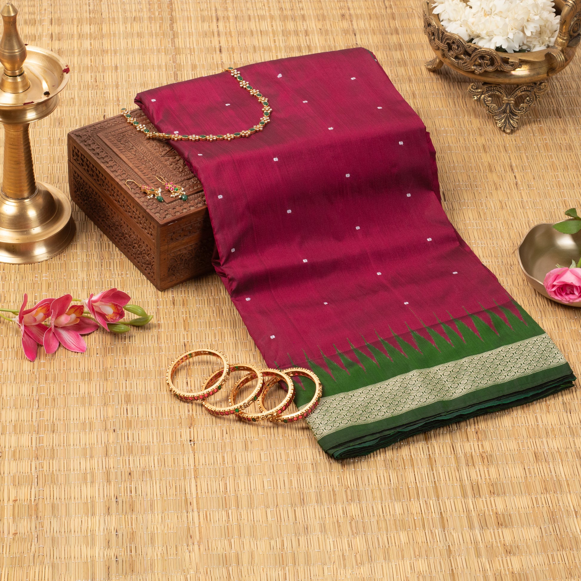 What sets this saree apart is its intricately detailed pallu, a testament to fine craftsmanship. Delicate specks of yellow woven into the pallu add a touch of brilliance, accentuating its allure.