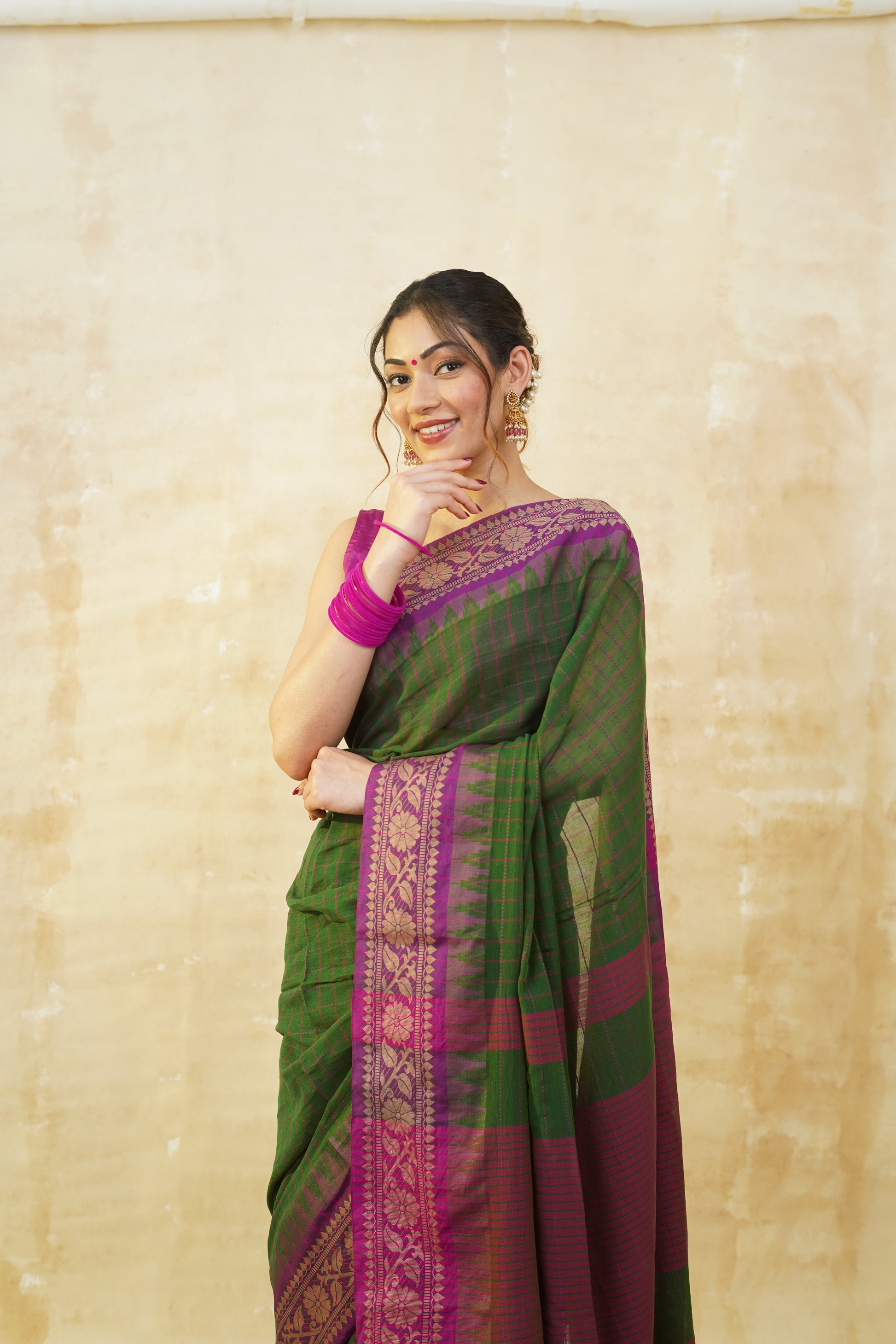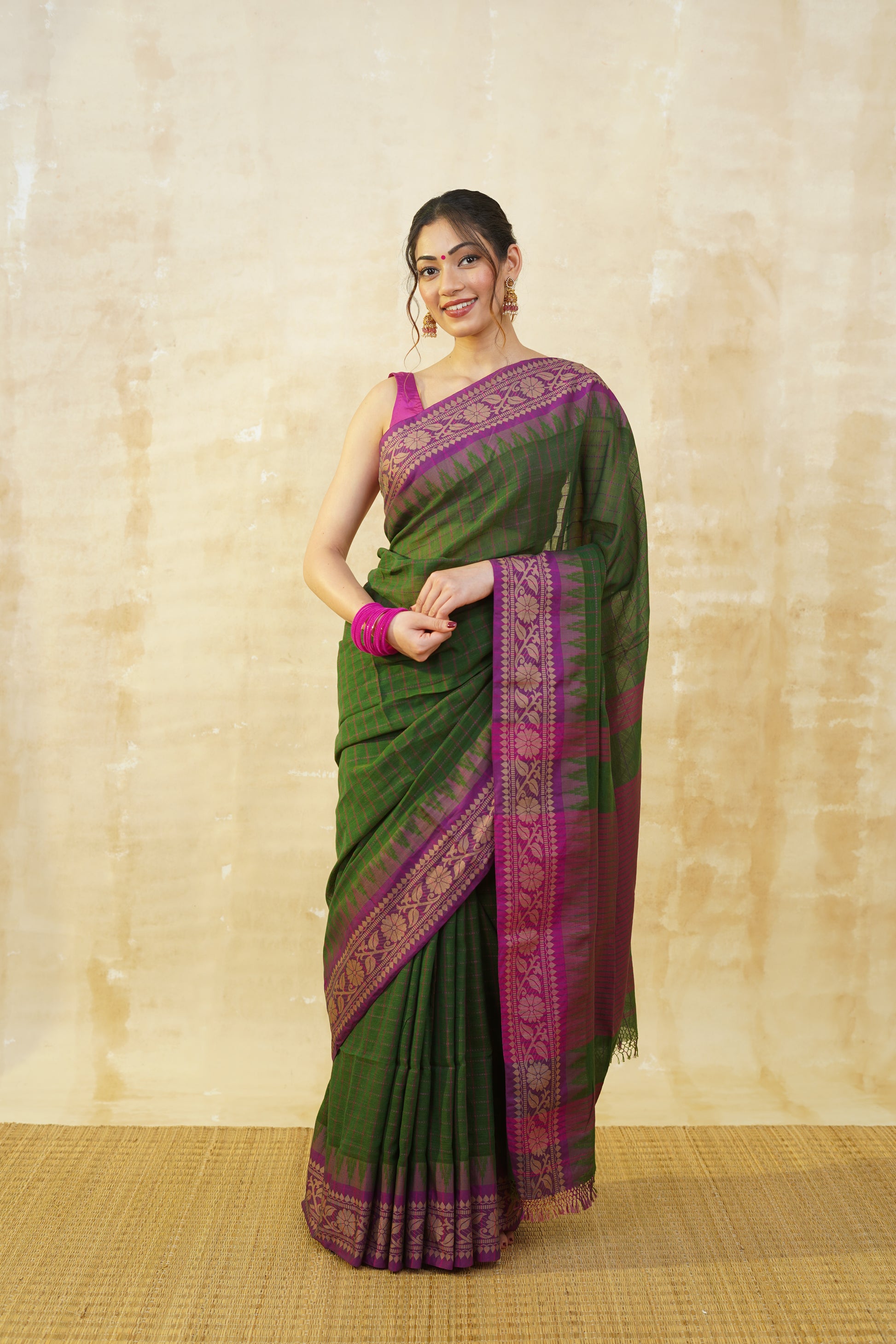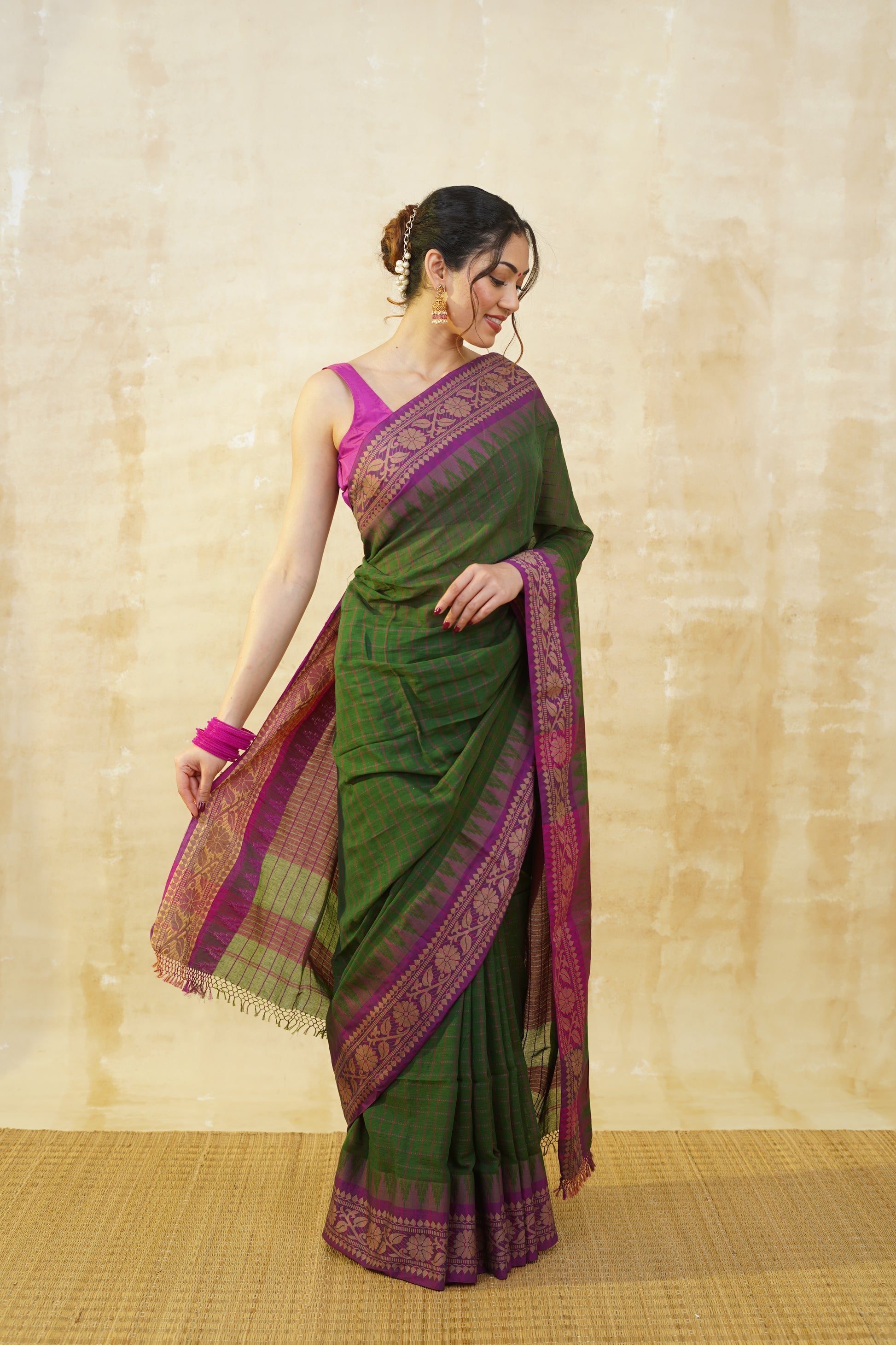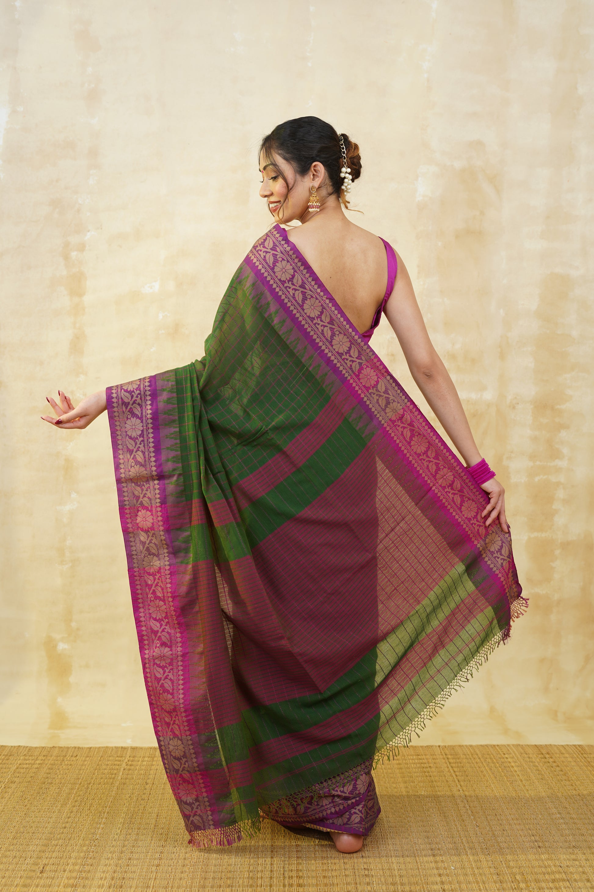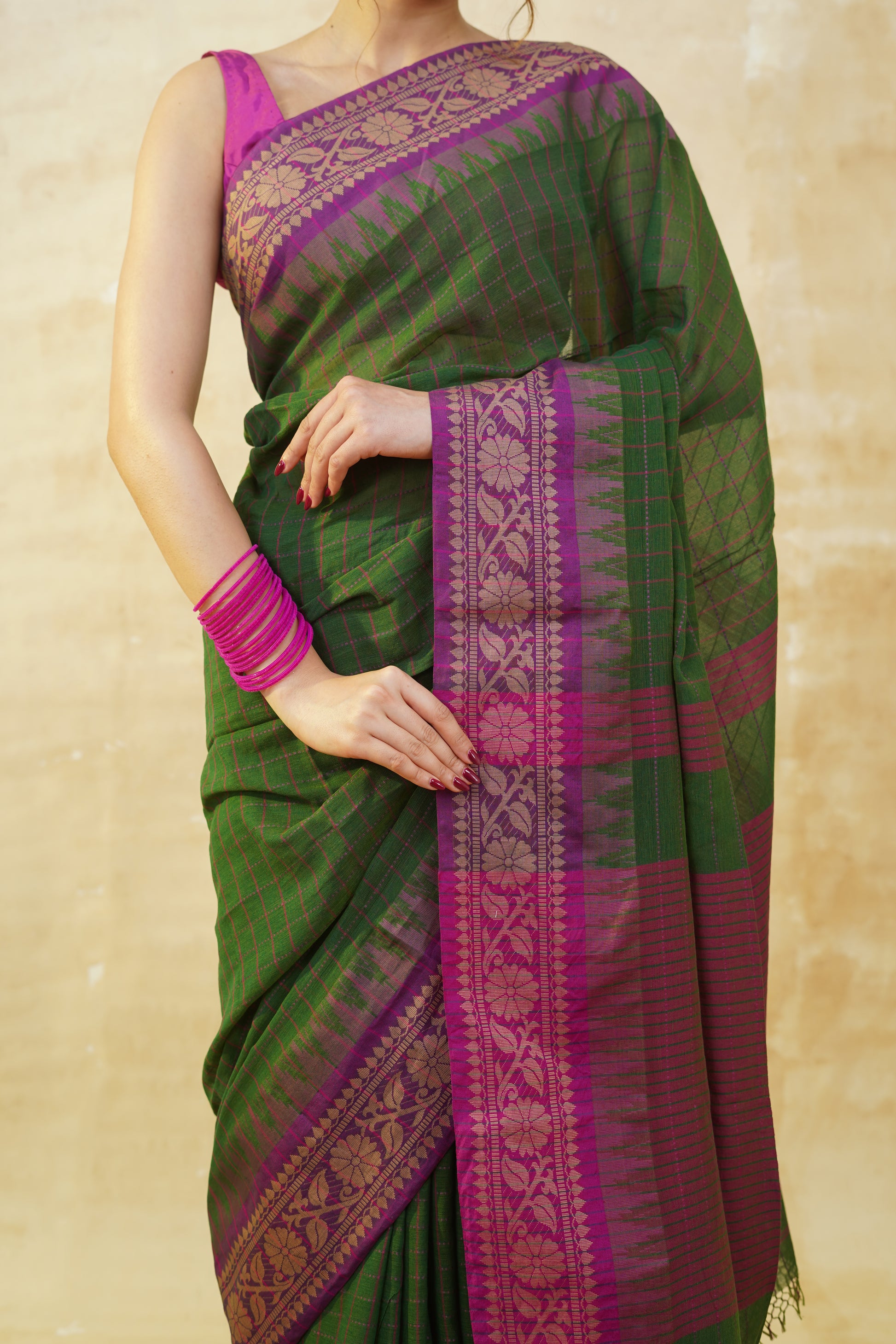 Deep Green & Purple Checked Pure Cotton Saree