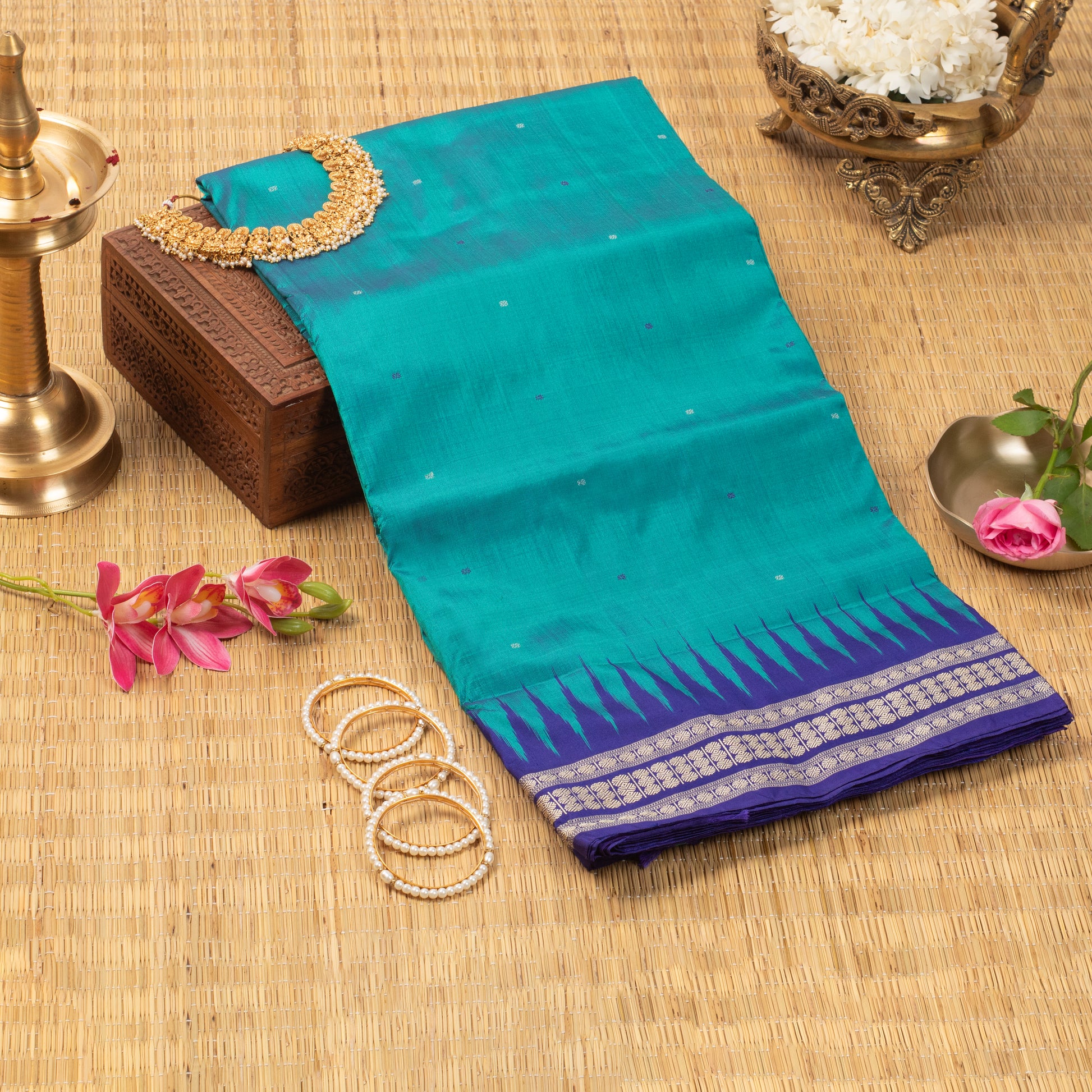 Crafted with meticulous detail, the pallu is a masterpiece in itself, boasting intricate designs that mesmerize with their beauty. The interplay between turquoise blue, violet, and royal blue in this saree creates a harmonious symphony, offering an exquisite and distinctive look that's bound to turn heads.