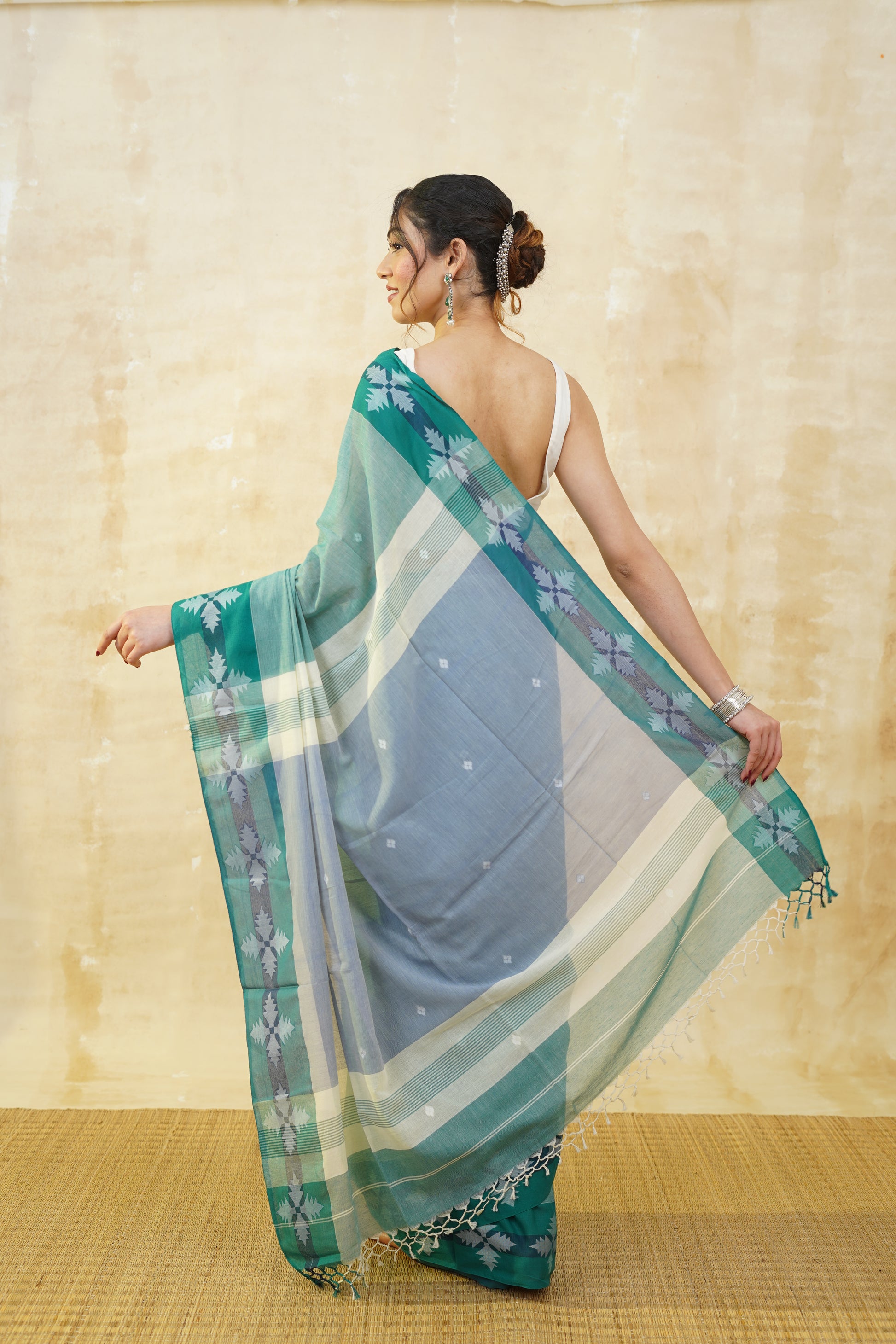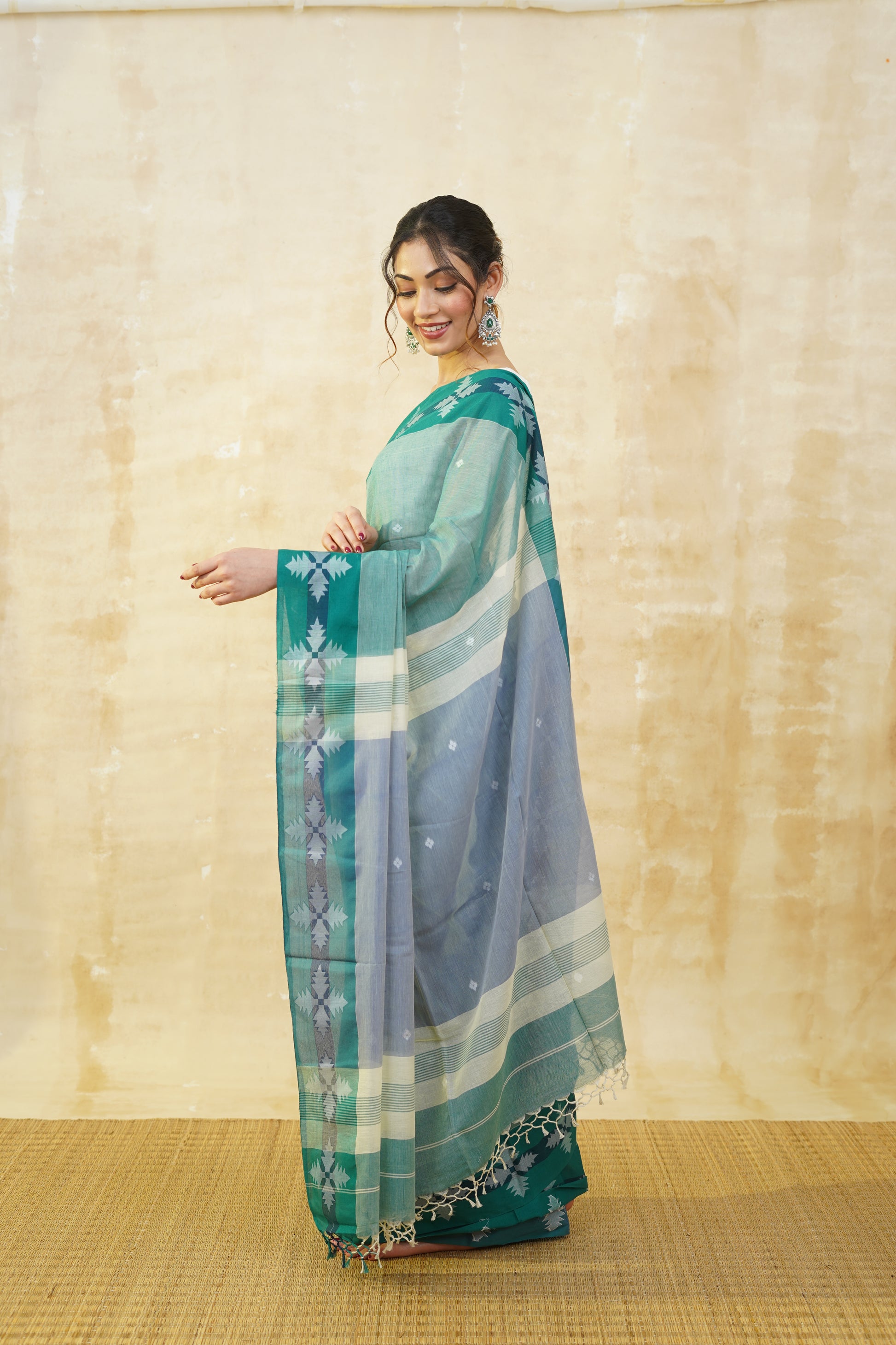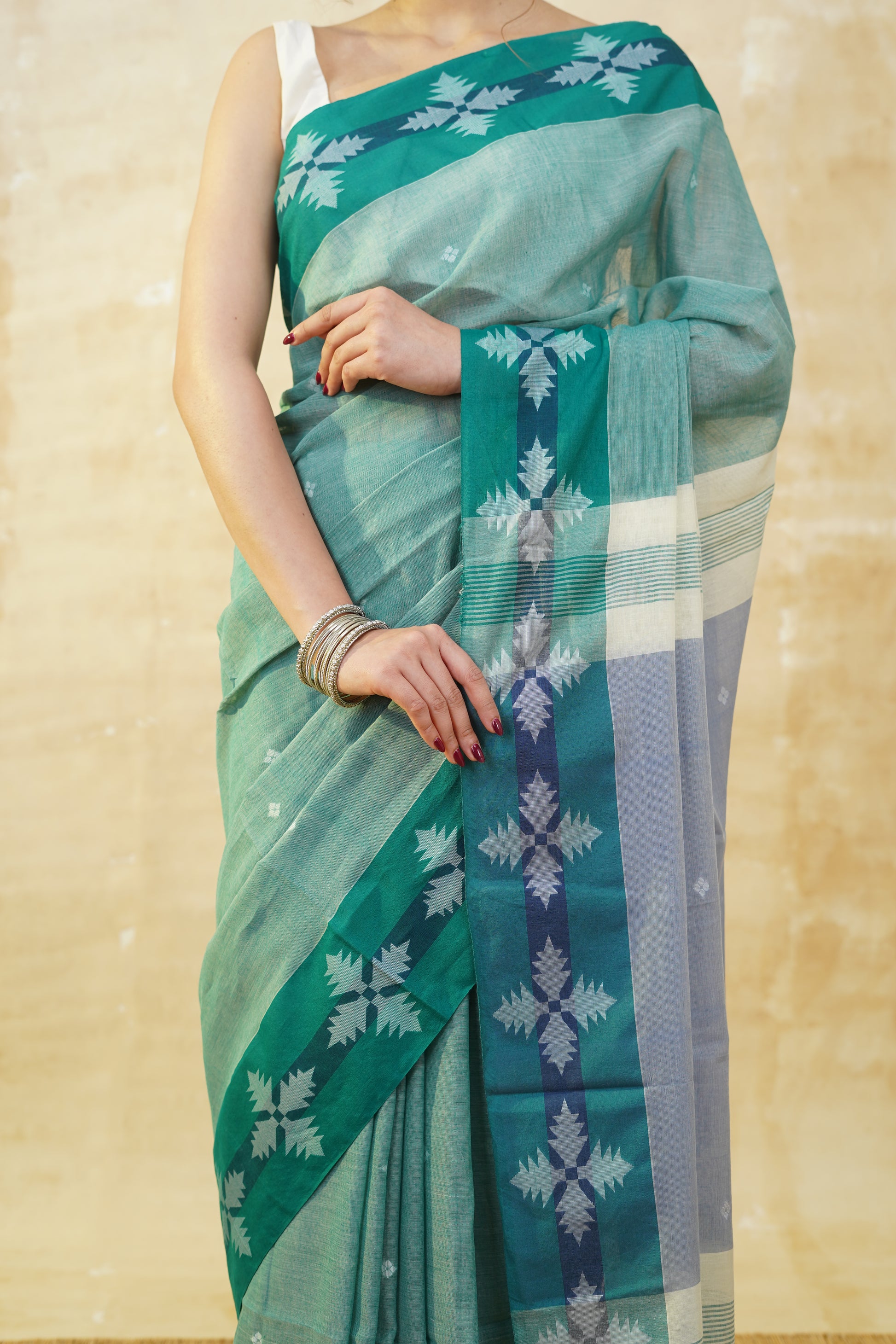 This saree is comfort personified! The rich pine green hue exudes an earthy elegance, while the 100% pure cotton fabric offers an exceptional level of softness and breathability. With its lightweight, flowy texture, the saree drapes beautifully, making it perfect for all-day wear. The subtle border adds a touch of sophistication, while the body of the saree is adorned with intricate woven motifs, providing a delightful balance of tradition and modern charm. Whether for a casual gathering or a day out in the city, this saree’s timeless appeal and unmatched comfort are sure to make you feel effortlessly graceful.