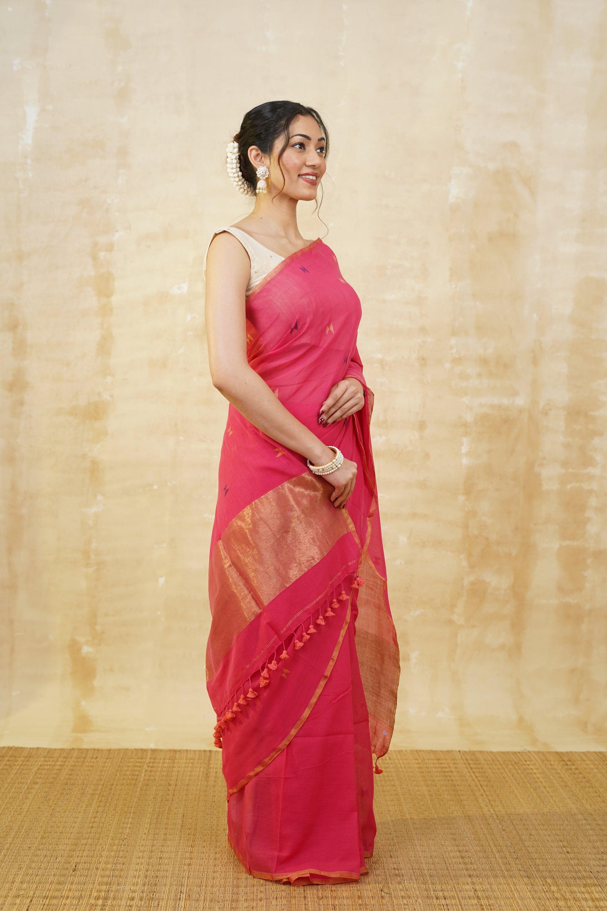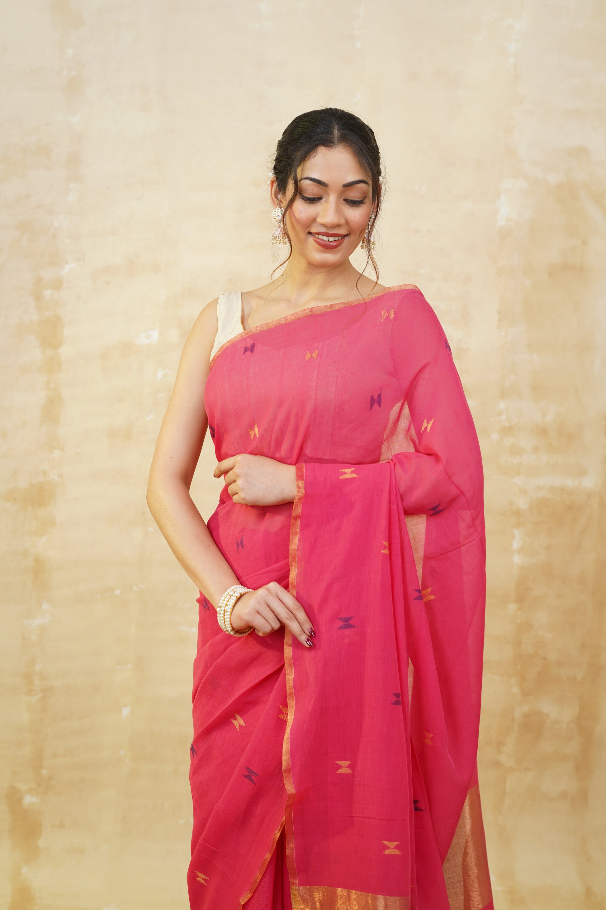 Crafted from 100% pure cotton, this saree is as comfortable as it is beautiful, offering unmatched softness, breathability, and a lightweight drape that’s perfect for all-day wear. The thoughtful details and delicate weave create a harmonious blend of traditional craftsmanship and modern aesthetics.