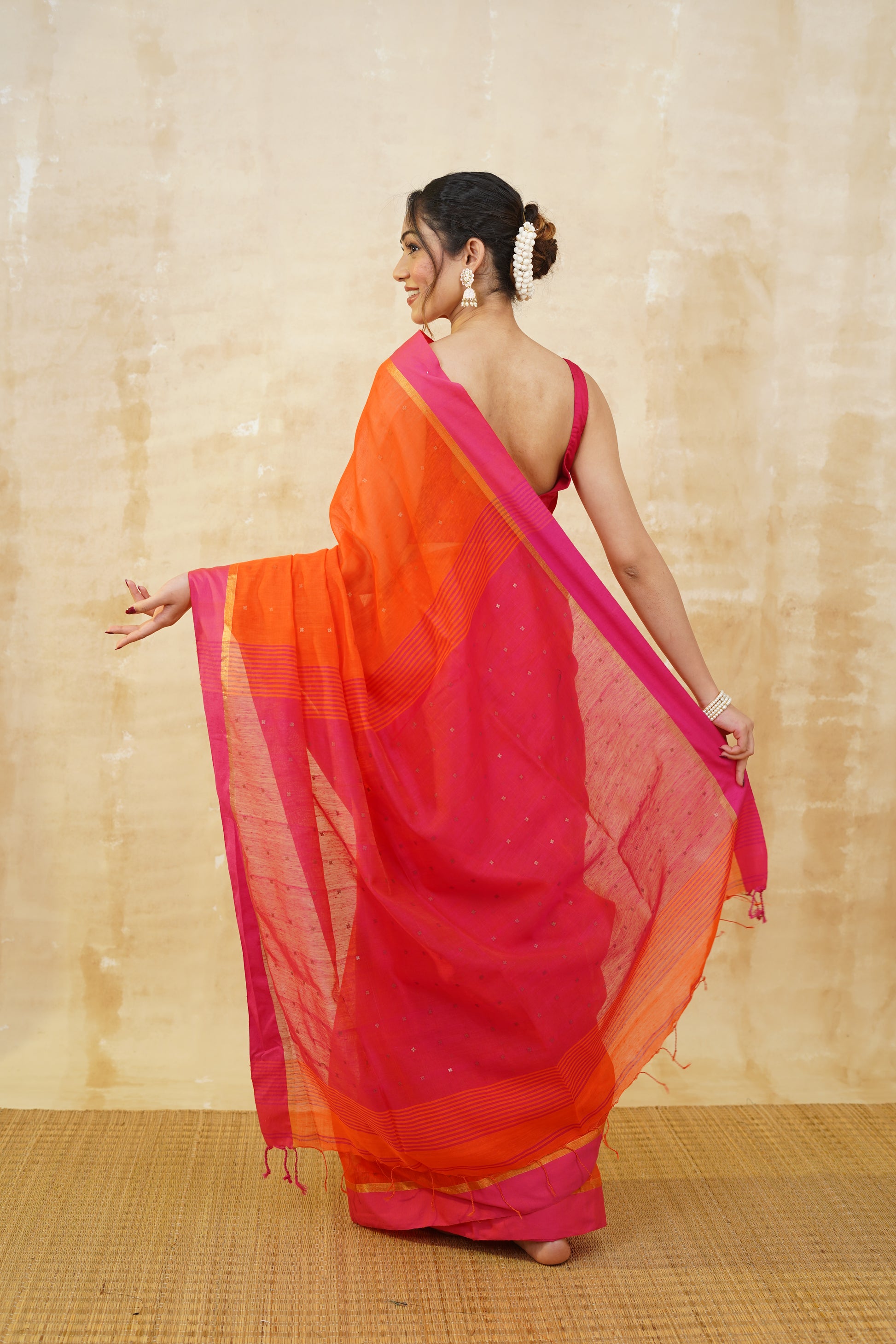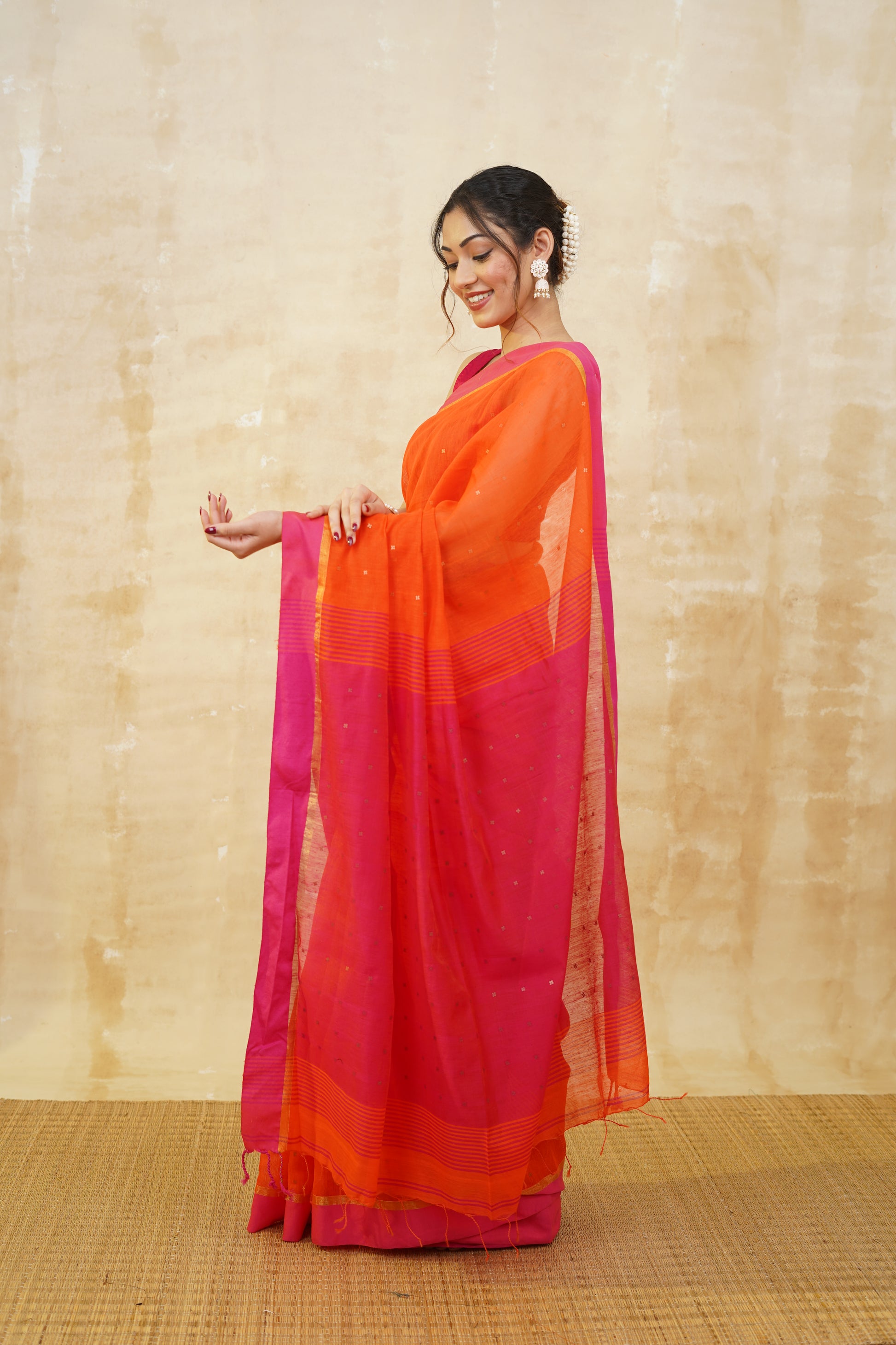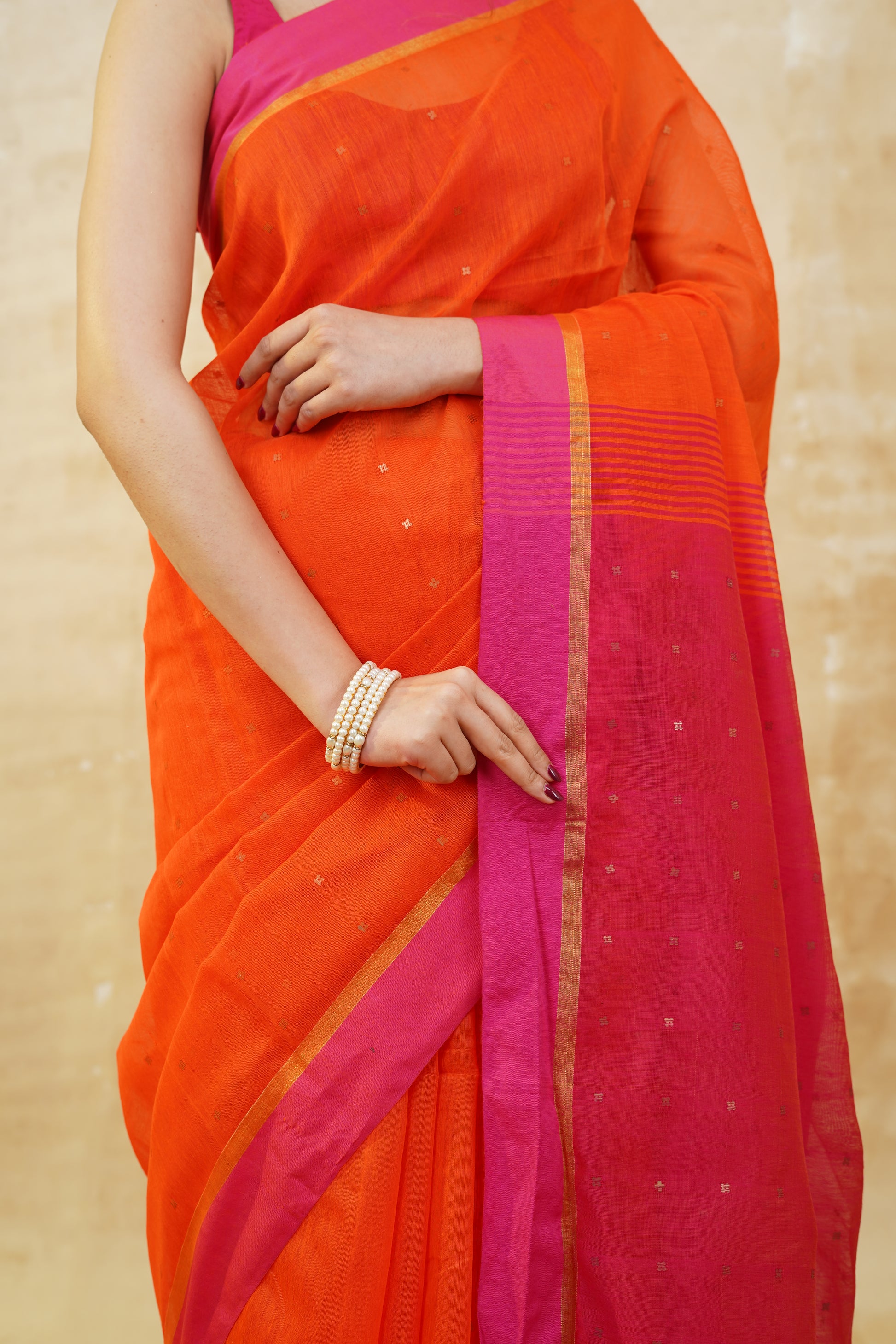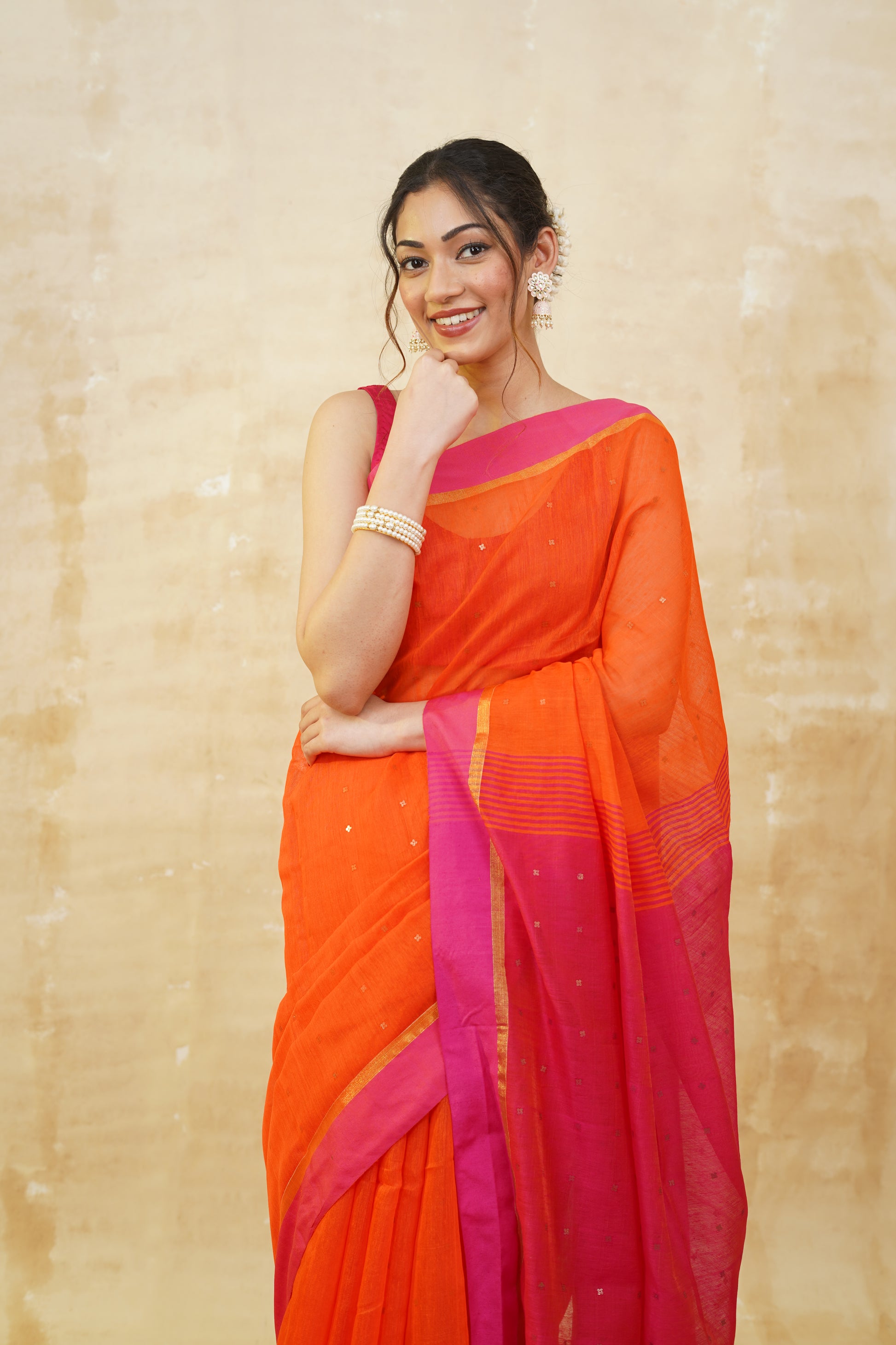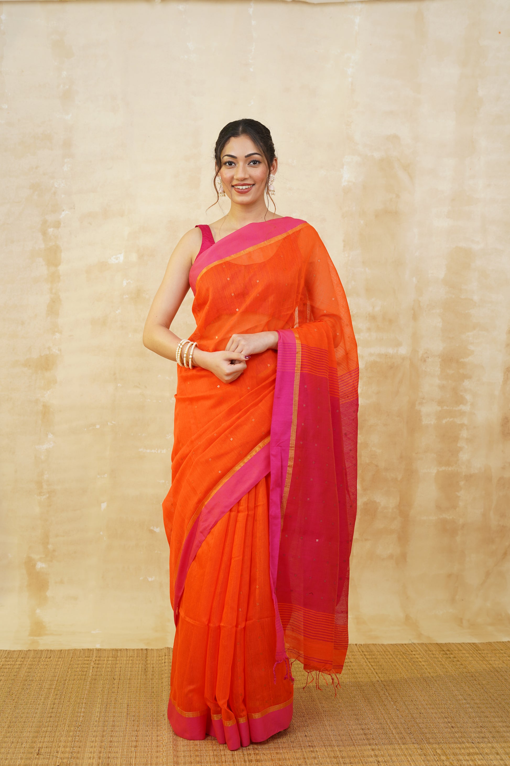 This Vivid Orange Cotton Saree with a Pink Border is a vibrant blend of bold color and timeless grace. The striking orange body radiates energy and warmth, perfectly balanced by the contrasting pink border that adds a touch of softness and sophistication.